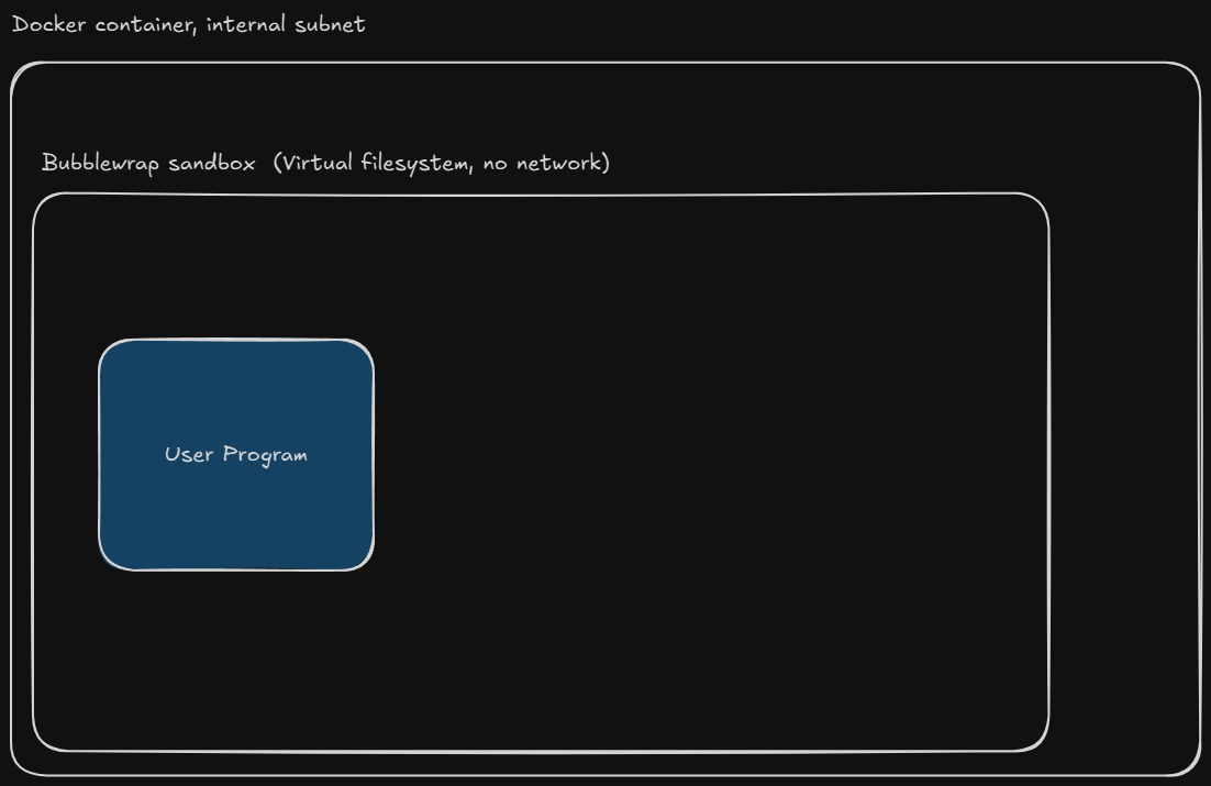 The checker application runs in an isolated container. The checkers' container network is launched in isolation from the general subnet.
